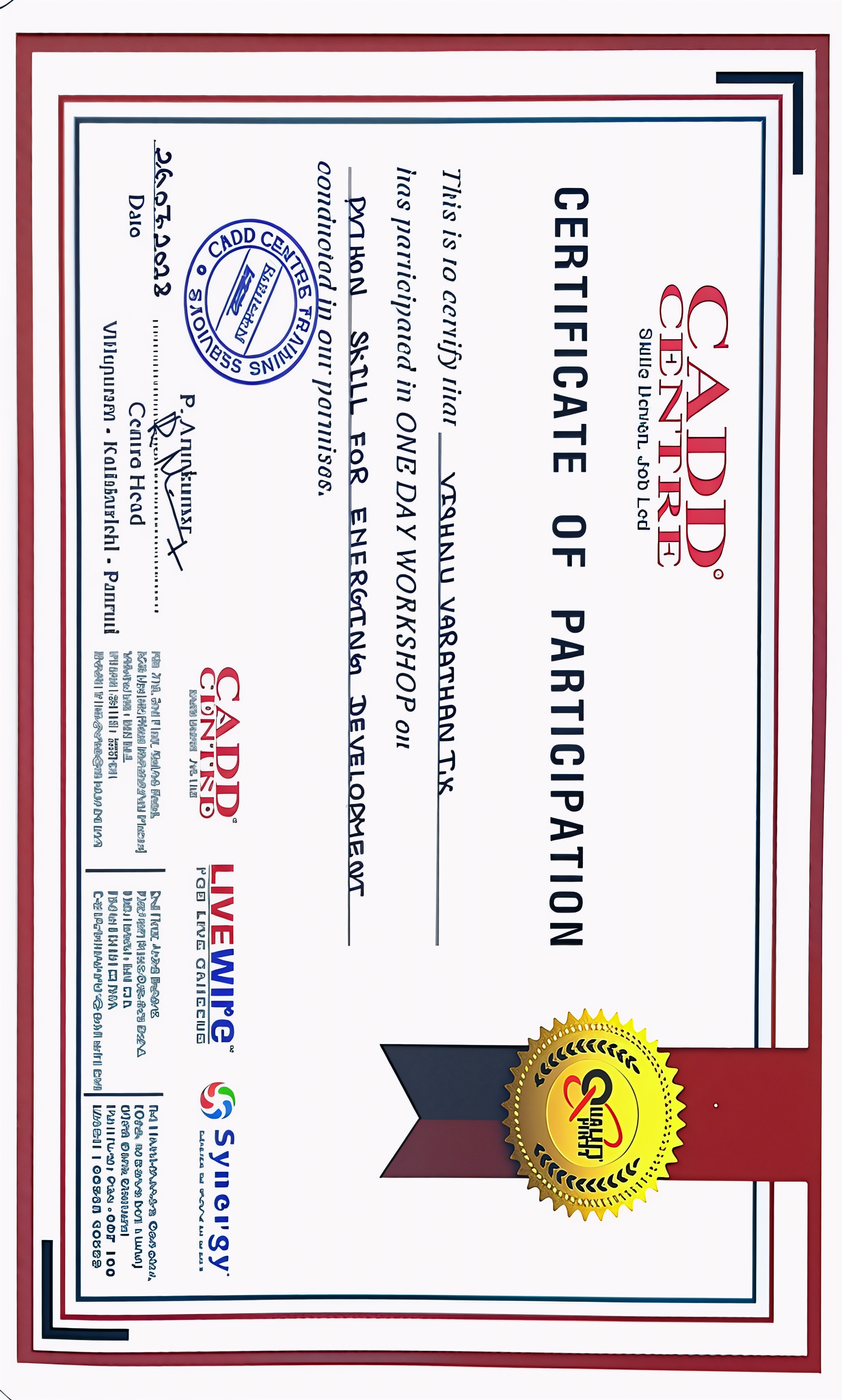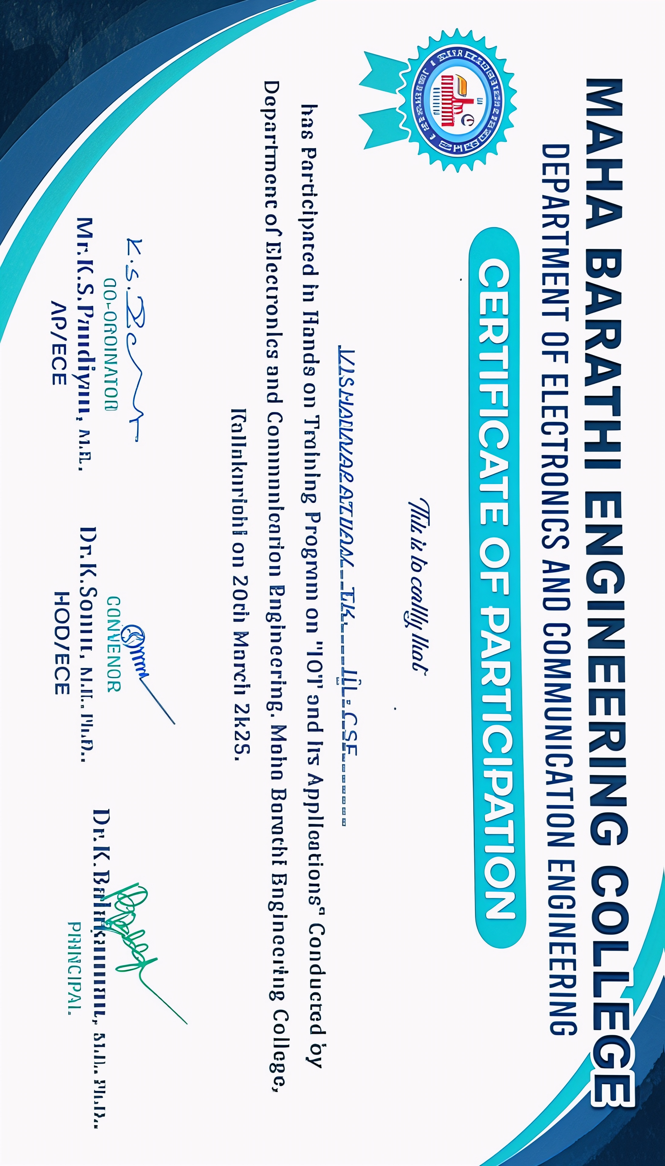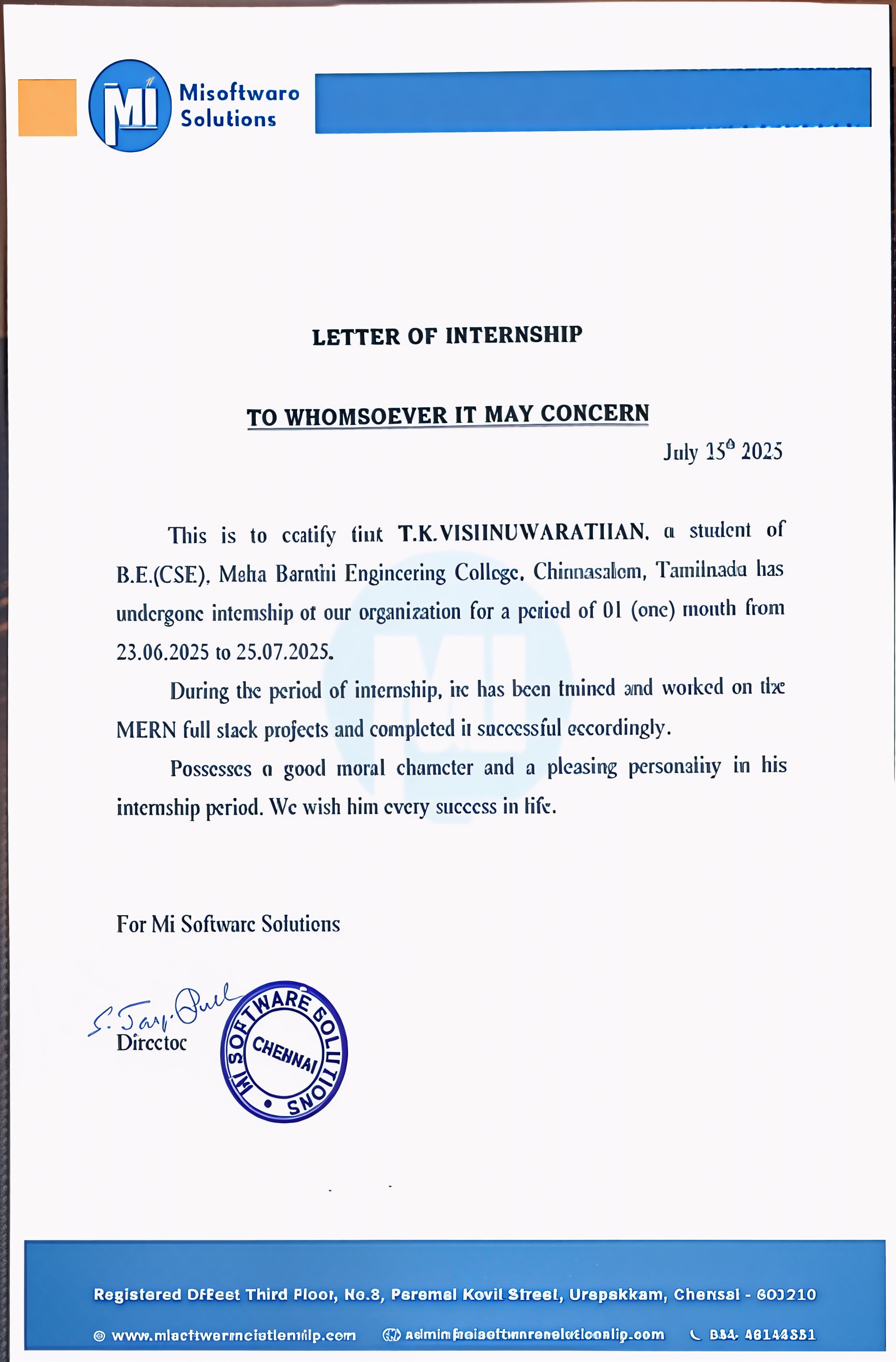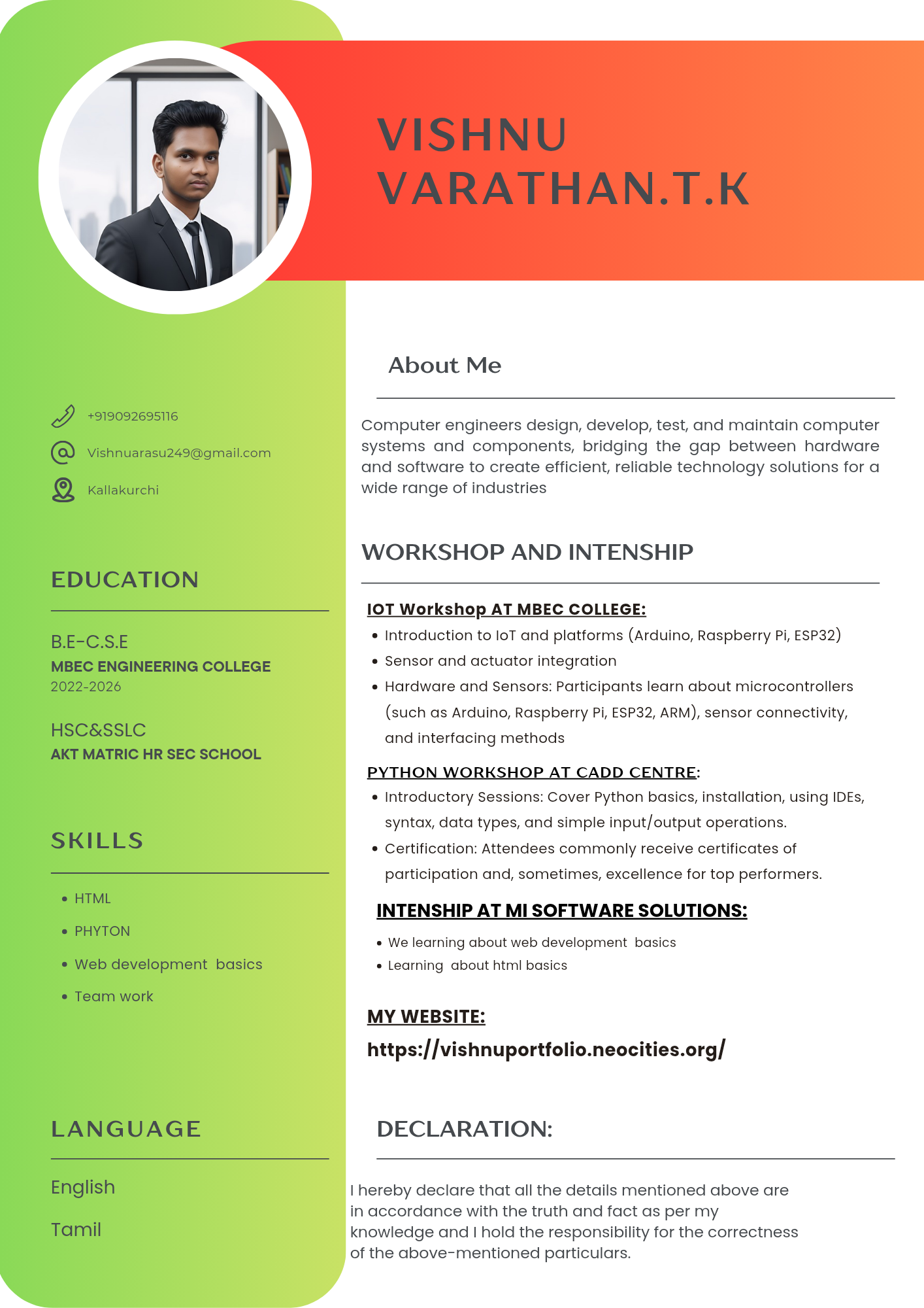 Hi! I'm Vishnu Varathan.T.K, currently pursuing B.E. Computer Science & Engineering at MBEC College (2022-2026). Passionate about web development, IoT, Python programming, and collaborative team projects. I believe in learning by doing and thrive in dynamic, creative environments. My journey is fuelled by workshops, internships, and organizing tech fests. Connect with me to explore more! I was a Lead Organizer for the Byte Fest '25, a grand symposium event at MBEC College, and Brand Buzz Fun Game Event, among other achievements.